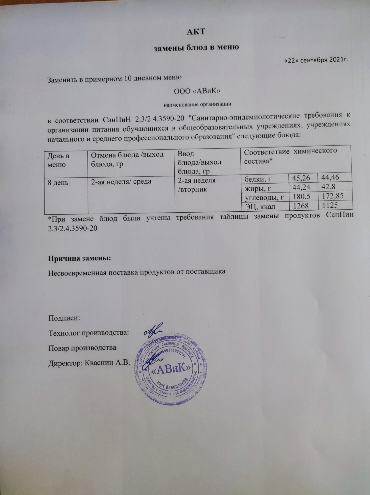 (Акт Замены блюда)