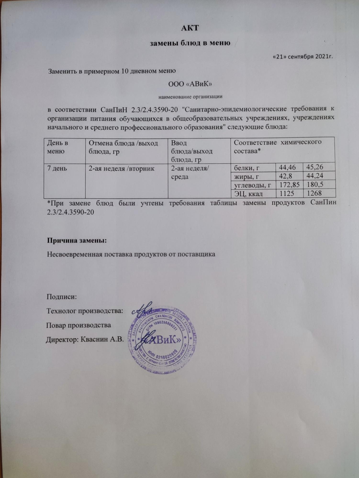 (Акт замены блюда)